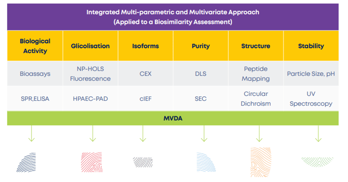 In this view, and consistent with the concepts of fingerprint-like similarity and of residual-risks, we suggest the use of multi-parametric and multivariate approaches to extensively compare the complete domains of the biosimilar and reference products.