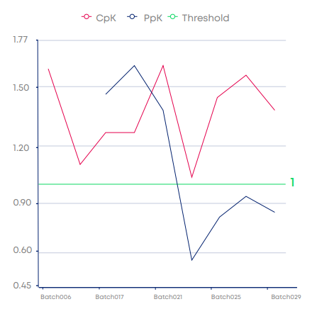 Variable configuration: Statistical control limits for each identified CQA, CPP, and CMA are configured, defining the statistical criteria for each critical variable control chart (see Figure 3) alongside other capability metrics like Process Capability Index (CpK) and Process Performance Index (PpK), which are measured during routine monitoring (see Figure 4). This step defines the control strategy and how each variable will be monitored during ongoing operations.