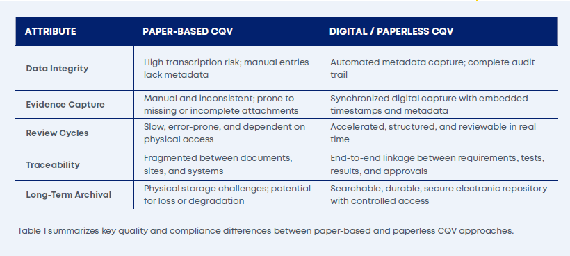 This paper explains why paper-based commissioning, qualification, and validation (CQV) no longer satisfies rising expectations for data integrity, traceability, and trustworthy records.